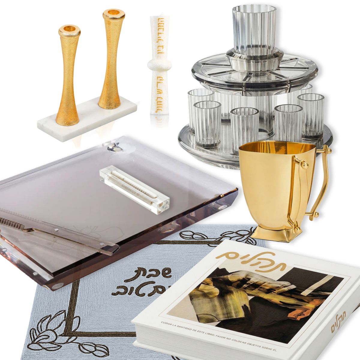 Bandeja de pan, Fuente de Kidush y Mezuza Apeloig donación anónima. Candelabros, Jala Cover, Netilat Yadaim y Vela donadas por Moderna Judaica. Libro de Tehilim donado por WIZO